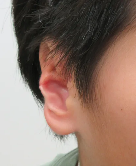 1回目肋軟骨移植術の術後2カ月が経過した状態です。比較的、腫れが目立たず耳の溝もしっかり出来ています。この状態ではまだ耳は立っていません。半年後の2回目手術で、耳立て(耳介挙上術)を行います。