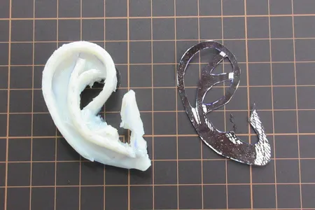 事前に作成した3D模型は、健側の左耳を3Dスキャナーでスキャンし、データを反転して3Dプリンターで出力したものです。3D模型を参考に、健側の耳に近づける工夫をしています。