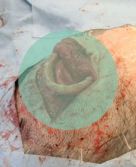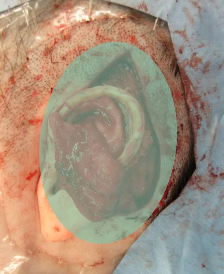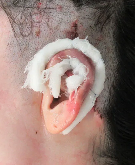 対耳輪上脚および耳輪の一部に欠損が認められたため、第8肋軟骨を採取し、耳介形態に合わせて細工した上で移植・再建を行いました。