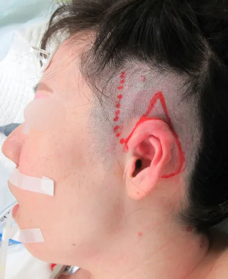 健側の右耳を参考に耳介を形成します。
