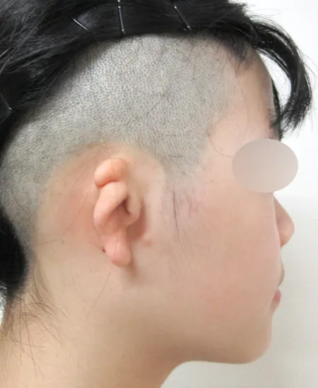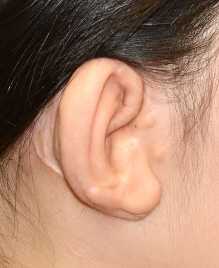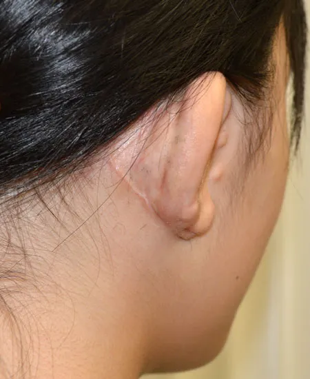 耳の溝も自然な凸凹が再現されています。耳の裏の皮膚も、植皮部分が周囲の皮膚の色調になじみ、傷跡は目立ちにくくなっています。