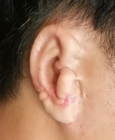3次元肋軟骨フレームを皮下ポケットへ移植して再建した耳介です。耳の溝がしっかりできています。